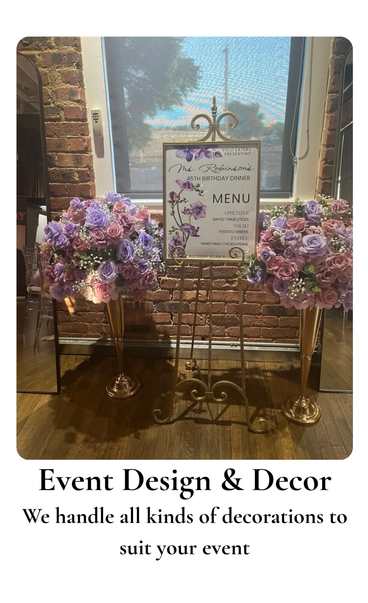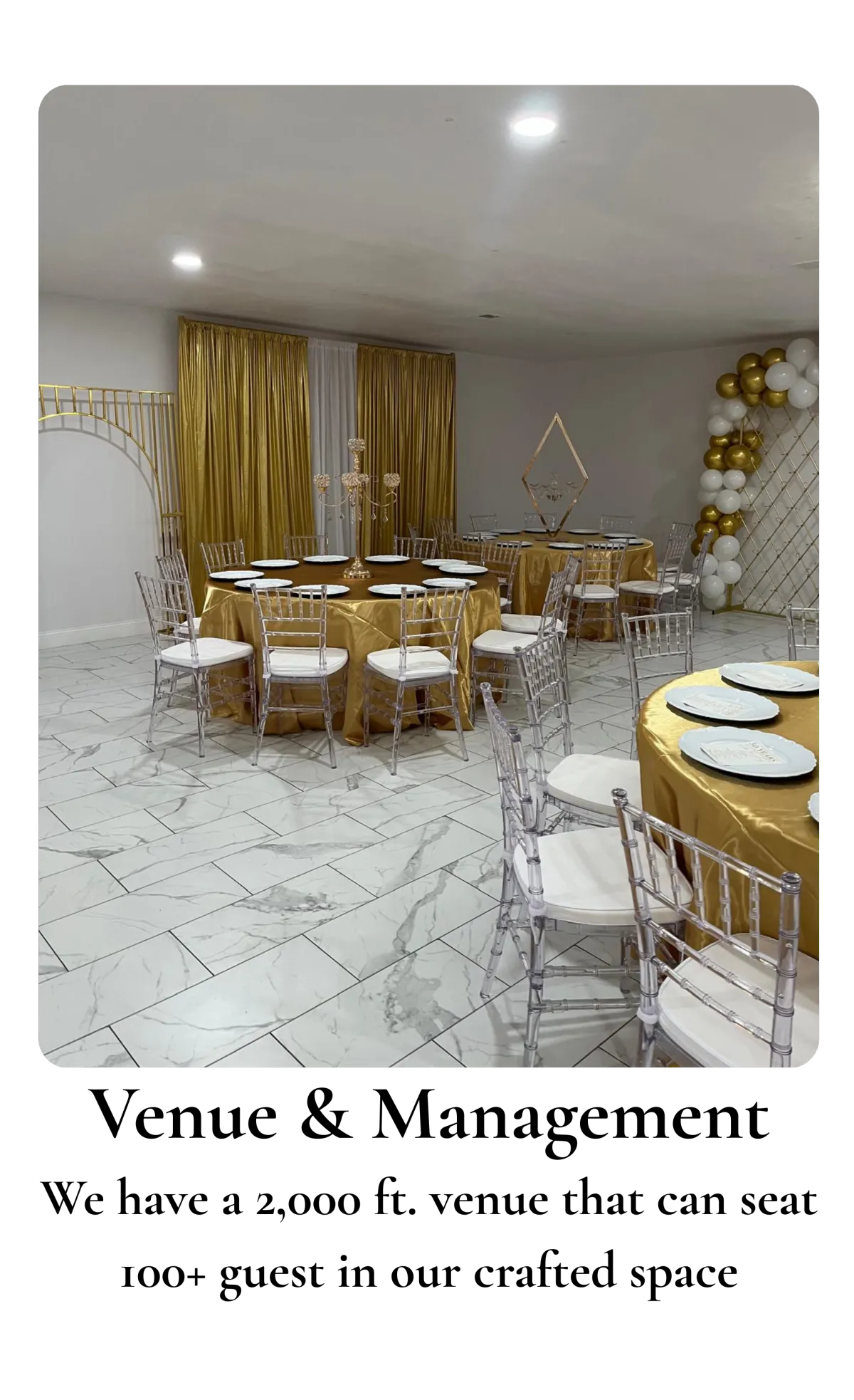 Décor and planning are available as add-on services. We’ll gladly connect you with our in-house planner or trusted vendors.